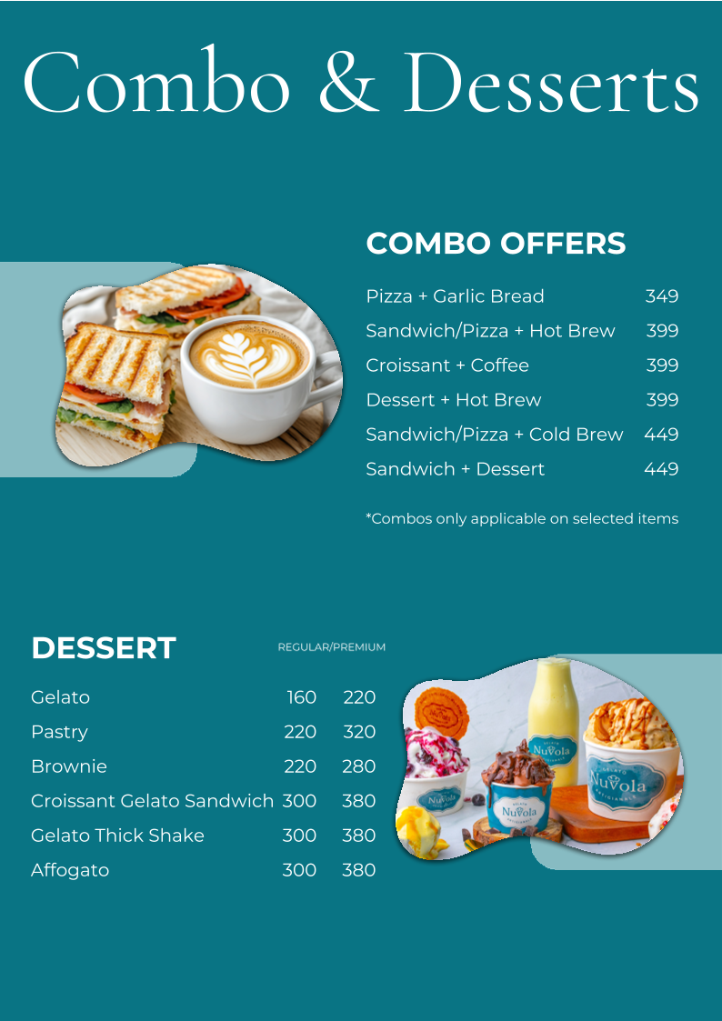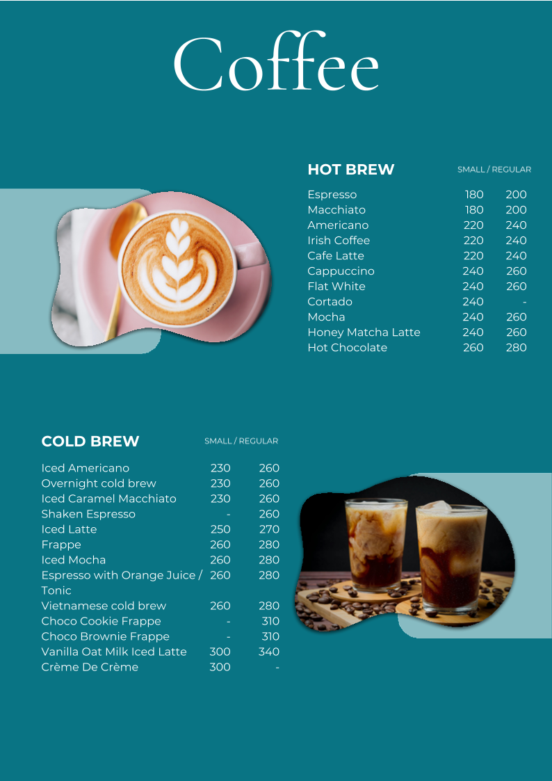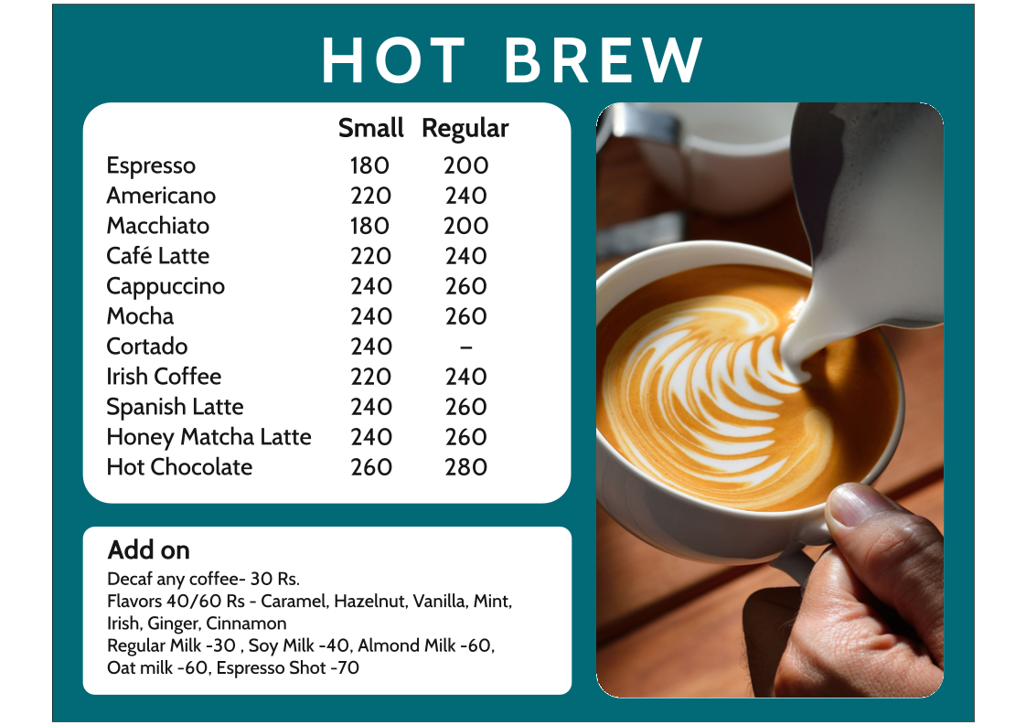 This menu serves well for different occasions, from quick coffee orders to casual light meals. Visitors can choose from specialty coffees and complementary desserts, making it appropriate for breakfast, mid-day breaks, or light afternoon refreshment.