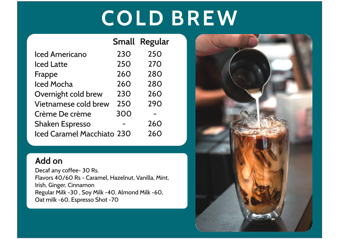 Hot brews include espresso and Americano varieties, offering bold and intense coffee flavors suitable for a quick caffeine boost or a focused coffee break. Cold brewed options such as Iced Americano and Iced Latte provide refreshing choices for warmer days or cooling refreshments.